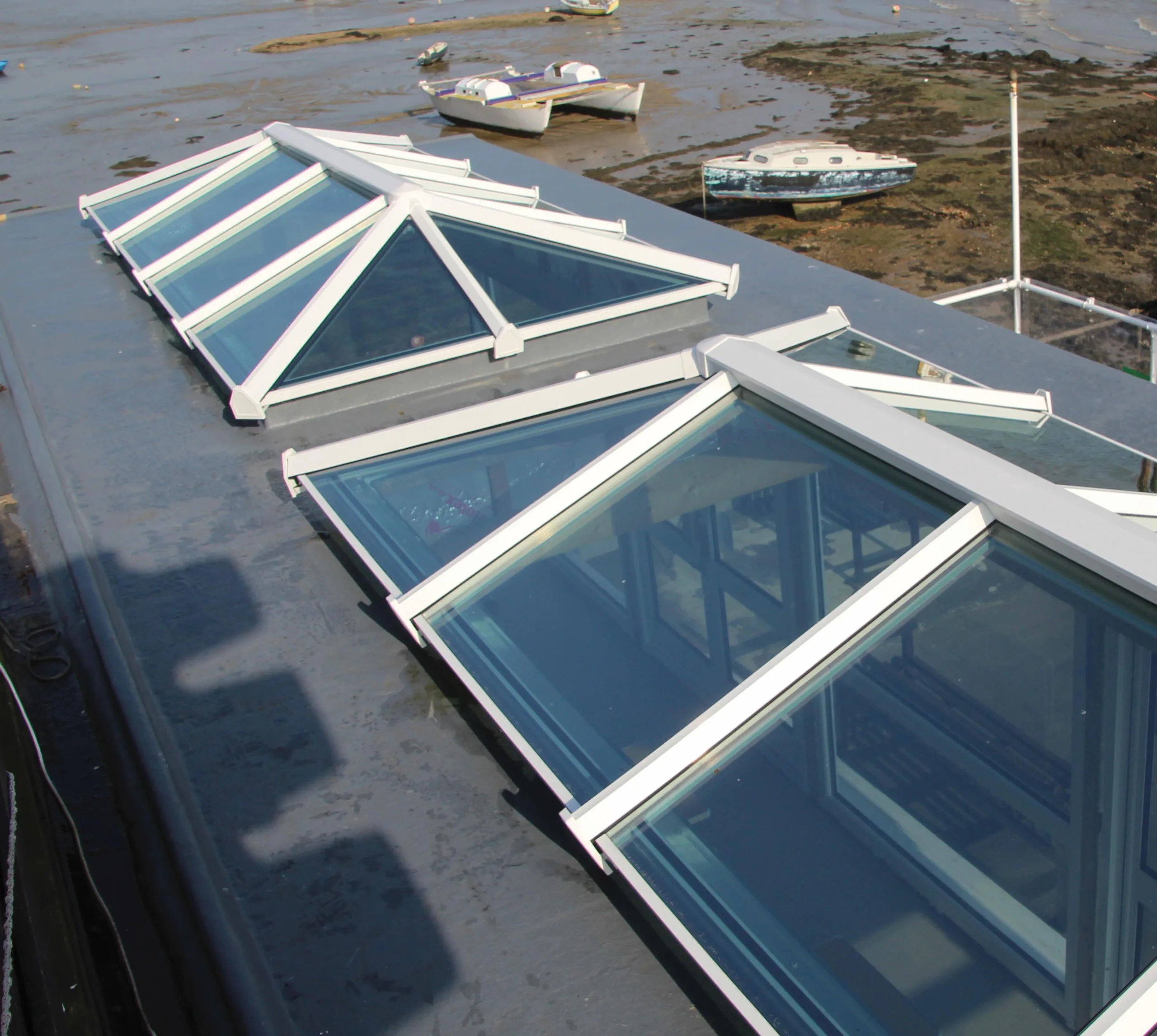 Options range from compact rooflights for small extensions to large lantern formats for communal or feature areas. Balanced bar alignment supports visual consistency, and the system integrates effectively into flat-roof build-ups commonly used in housing programmes.